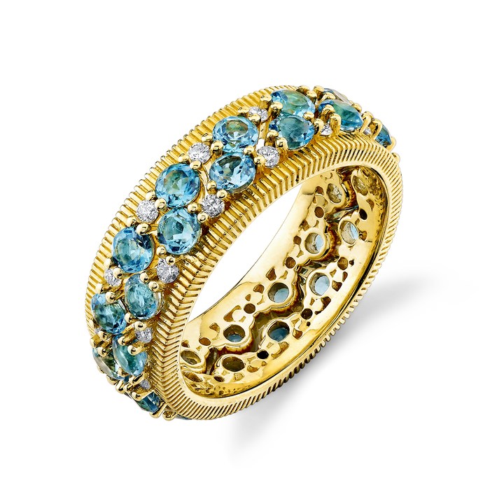 This 2-Row Eternity Band in 18K yellow gold features 28 round Swiss blue topaz stones totaling 3.22 carats, accented by 28 round diamonds with a combined weight of 0.42 carats. The strie-edged design adds subtle texture, enhancing the band’s elegance. Ideal for those seeking a refined and enduring symbol of style. Size 7