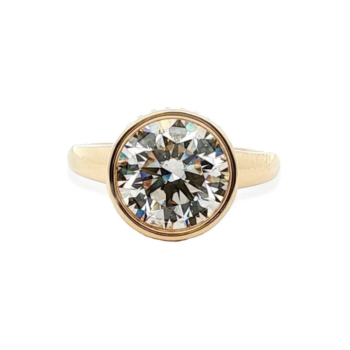 Crafted in 18K yellow gold, this engagement ring features a stunning 4.01-carat total weight round center diamond, surrounded by 28 additional diamonds totaling 0.28 carats. The combination delivers exceptional brilliance and timeless elegance, making it a distinguished symbol of lasting commitment. Designed with expert precision, this piece balances bold sparkle with refined craftsmanship for a truly memorable expression of love.