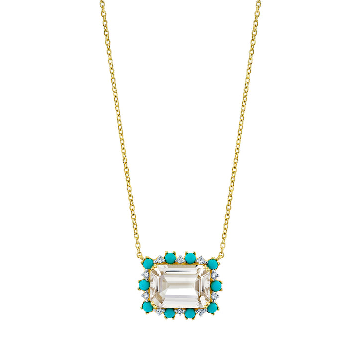 This refined pendant features a 4.50-carat total weight emerald cut white topaz bezel set in 18K yellow gold, accented by 0.39 carats of round turquoise and 0.10 carats of round diamonds. The 18-inch chain includes a jump ring at 16 inches for adjustable wear, seamlessly blending cool tones with warm gold for an elegant and versatile accessory.